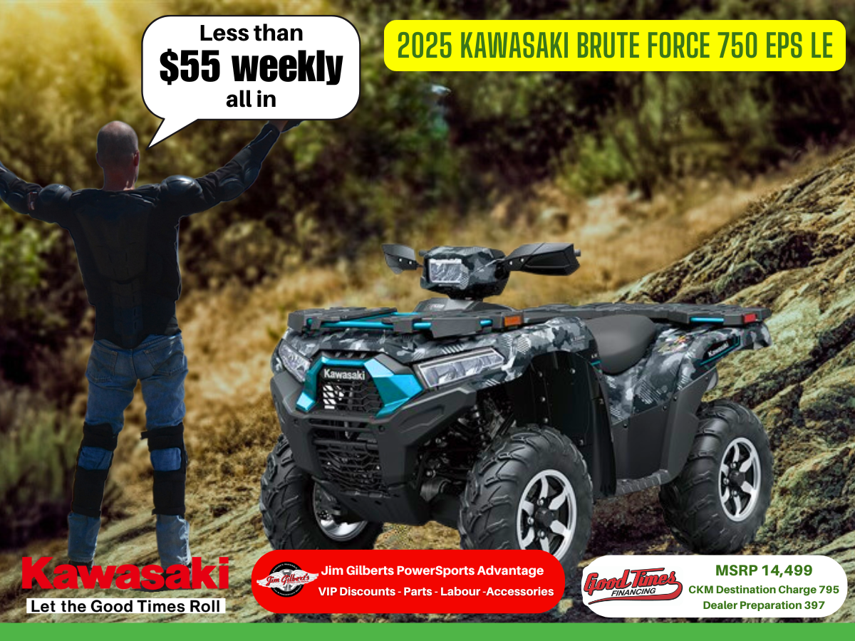 Meet the 2025 Kawasaki Brute Force 750 EPS LE — the do-everything ATV that works as hard as it plays. With a muscular 749cc V-twin, selectable 4×4 with variable front diff-lock, and speed-sensitive power steering, it’s purpose-built for New Brunswick’s mixed terrain. Add the MegaCash + Demo Value Package and Jim Gilbert’s trusted setup, and you’ve got serious capability with exceptional value.