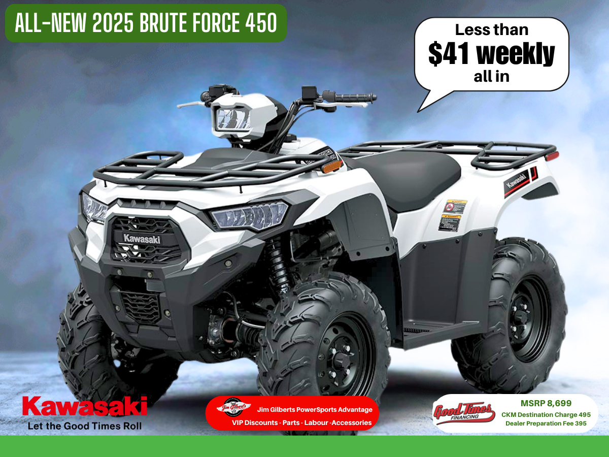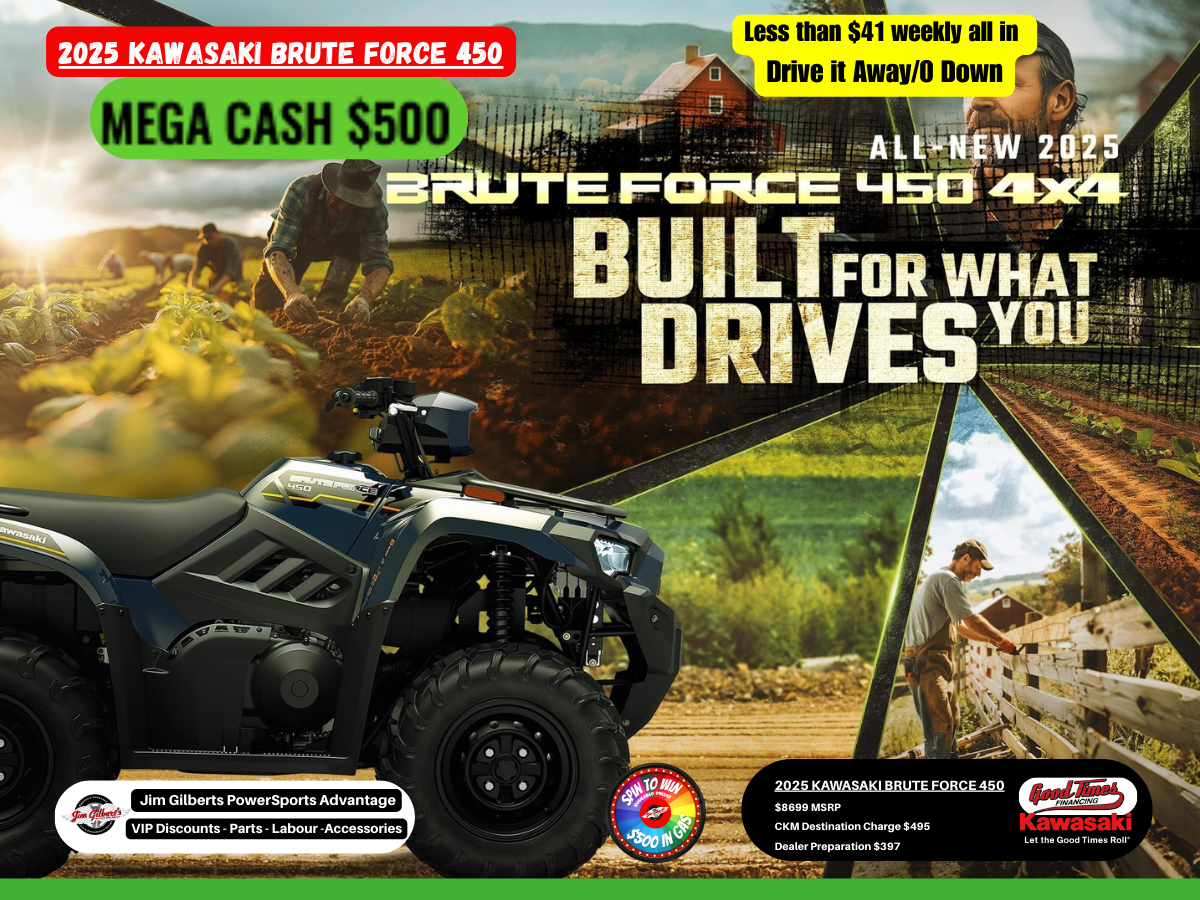 Looking for a mid-size ATV that works hard all week and still wants to play on the weekend? The 2025 Kawasaki BRUTE FORCE 450 brings dependable Kawasaki engineering to New Brunswick with a punchy 443cc fuel-injected single, on-demand 4x4, and LED lighting so your chores—and your fun—don’t stop at dusk. Add in long-travel independent suspension and confident braking, and you’ve got an ATV that feels right at home from woodlots to cottage trails.