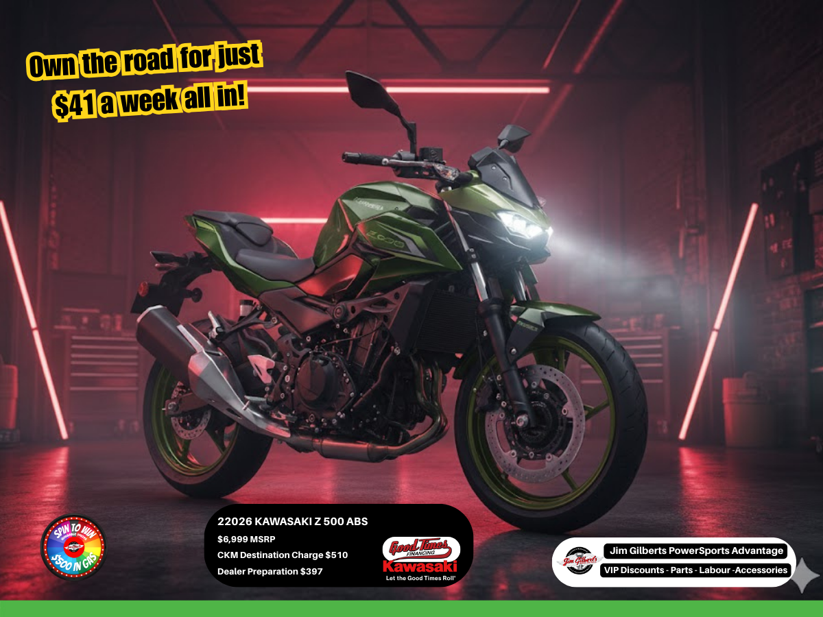 Stop traffic and turn heads with the all-new 2026 Kawasaki Z500 ABS, now available at Jim Gilbert’s PowerSports! ? This aggressively styled supernaked machine is built for riders who crave agility, punchy performance, and that iconic "Sugomi" attitude on the streets of New Brunswick. ?️