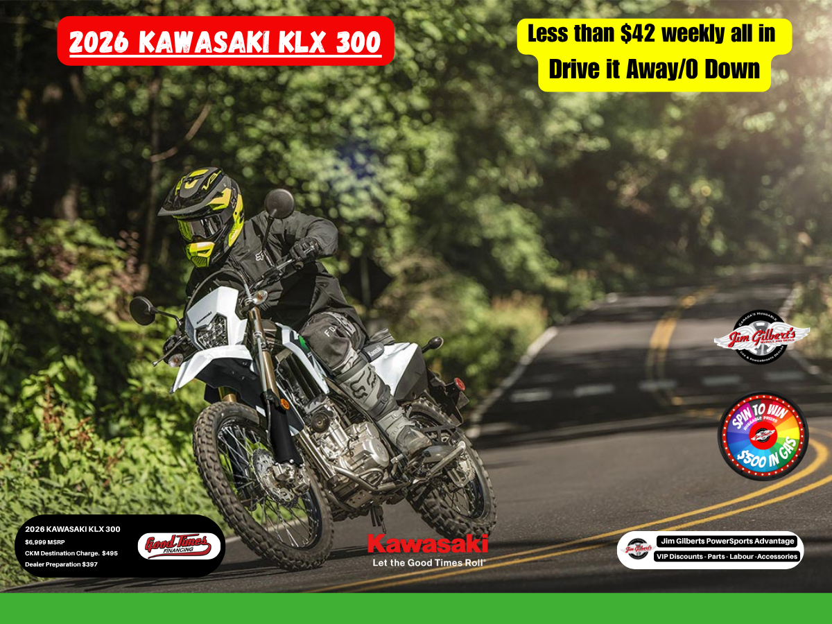 Looking for one bike that can do it all? The 2026 Kawasaki KLX 300 delivers confident road manners and genuine trail capability in a lightweight, easy-to-own package. With responsive 292cc power, a forgiving chassis, and street-legal equipment, it’s the fun, reliable dual-sport that fits weekday commuting and weekend exploring across New Brunswick—without breaking the bank.