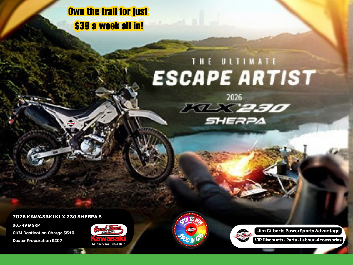 Stop dreaming and start exploring with the all-new 2026 Kawasaki KLX 230 Sherpa S, now available at Jim Gilbert’s PowerSports in Fredericton! ? This isn't just a bike; it's your ticket to the hidden gems of New Brunswick’s backcountry. ?️ Designed with a "rugged outdoor gear" aesthetic, the Sherpa S is built to handle the dirt, the mud, and the gravel with absolute ease. ?
