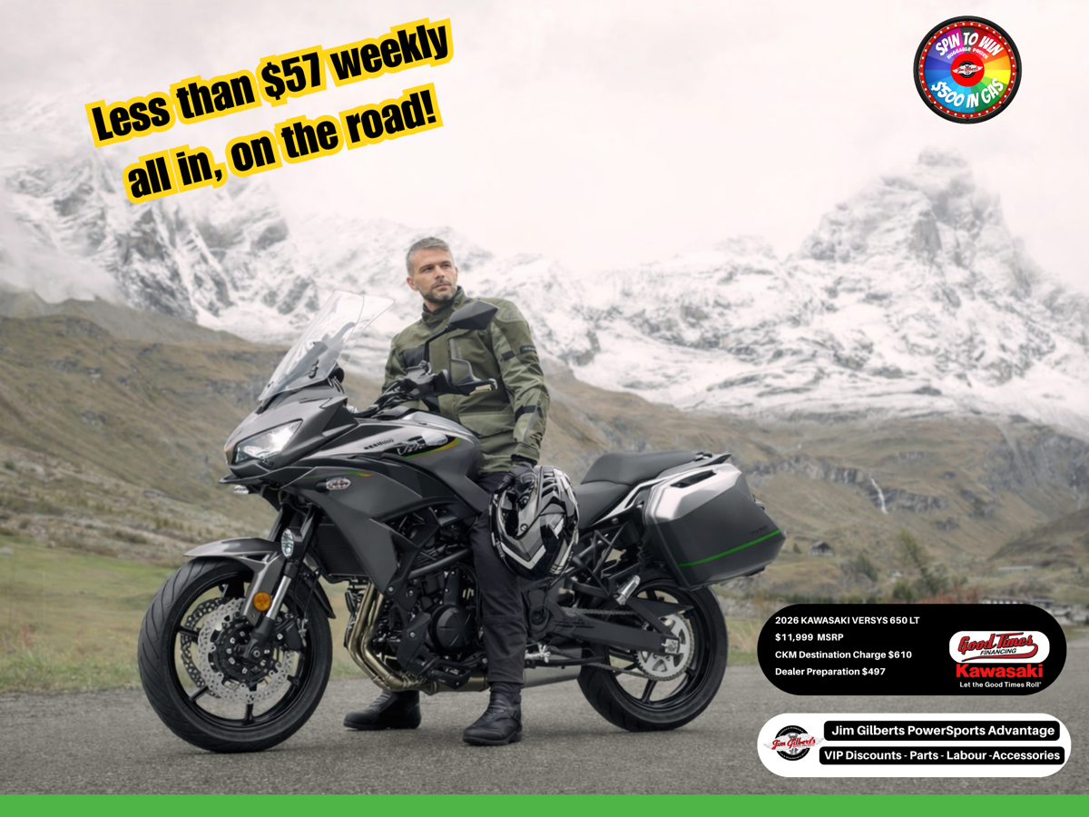 Looking for the ultimate New Brunswick explorer? ? The 2026 Kawasaki Versys 650 LT has arrived at Jim Gilbert’s PowerSports! ?️? Whether you’re heading to the office or heading for the coast, this bike does it all with style and comfort. ? Comes standard with quick-release hard saddlebags, hand guards, and adjustable wind protection! ?️ Ride with confidence thanks to Kawasaki Traction Control and ABS. ? Stay connected with the full-colour TFT dash and smartphone integration! ?