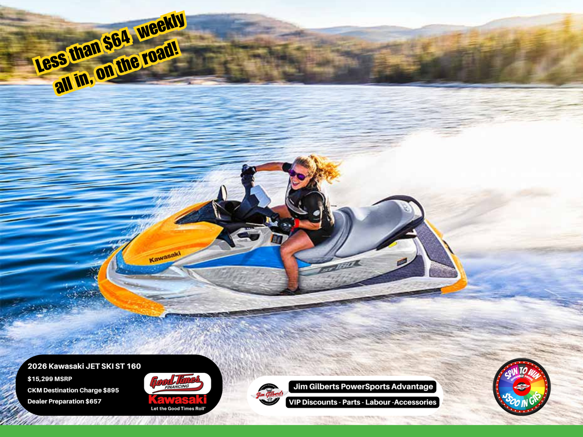 Are you ready to dominate the Saint John River? The 2026 Kawasaki Jet Ski ST 160 has arrived at Jim Gilbert’s PowerSports in Fredericton, and it’s built to turn every weekend into an epic New Brunswick adventure! 🇨🇦 This 3-passenger powerhouse is the perfect blend of high-performance thrills and family-friendly value. Whether you're towing the kids on a tube or carving tight turns near Grand Lake, the ST 160 delivers the "sizzle" you’ve been looking for! 🔥